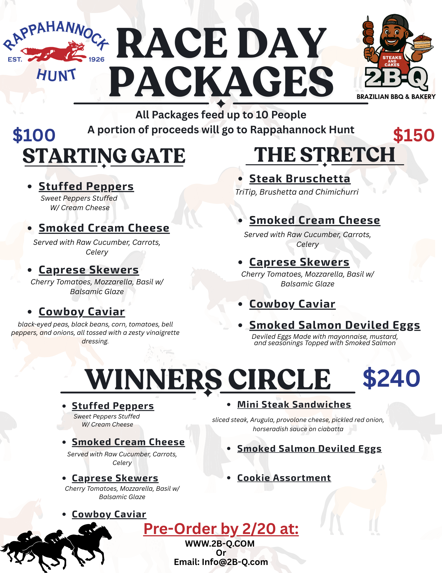 *New for 2026* We will be offering reserved parking spots on the Course! Click here to view the 2026 Course Map. Additionally, our friends at B2-Q are offering catering packages for your tailgate. Click here to see the packages and contact B2-Q directly for ordering. A percentage of the catering packages benefits Rappahannock Hunt!